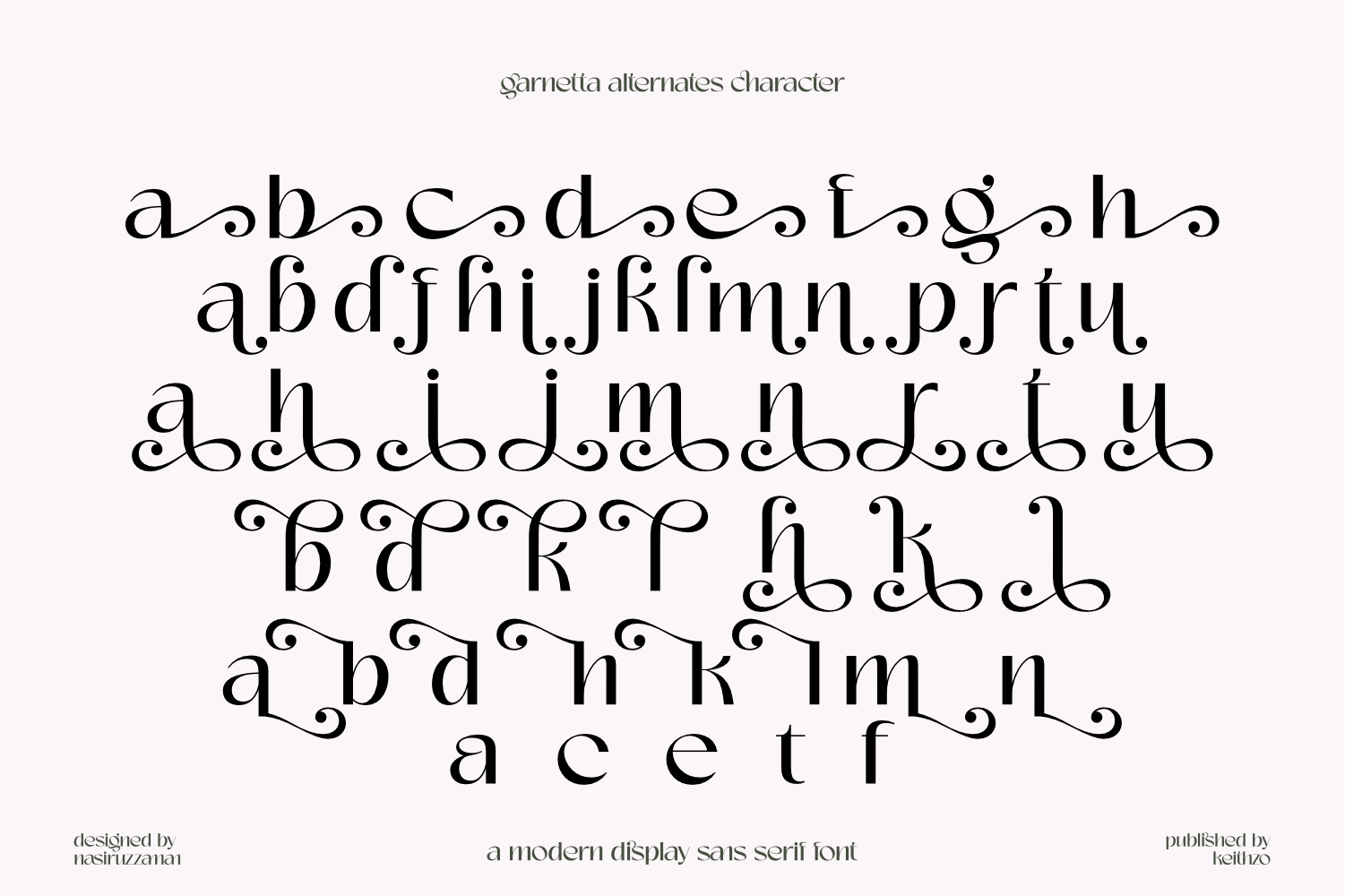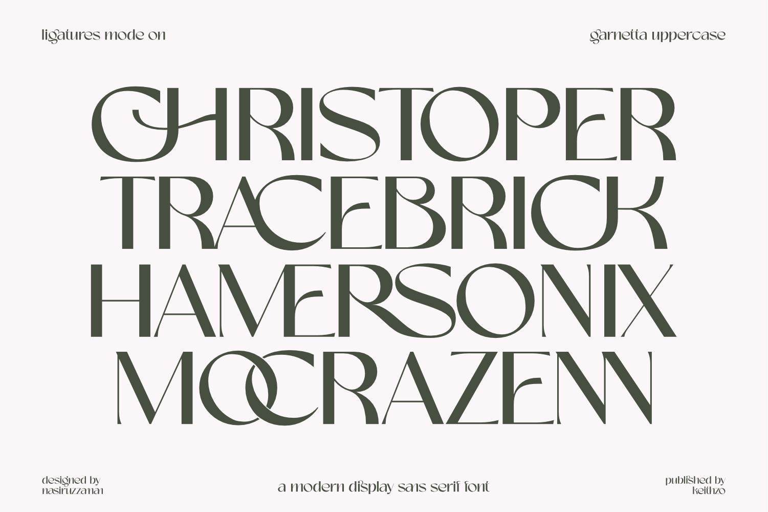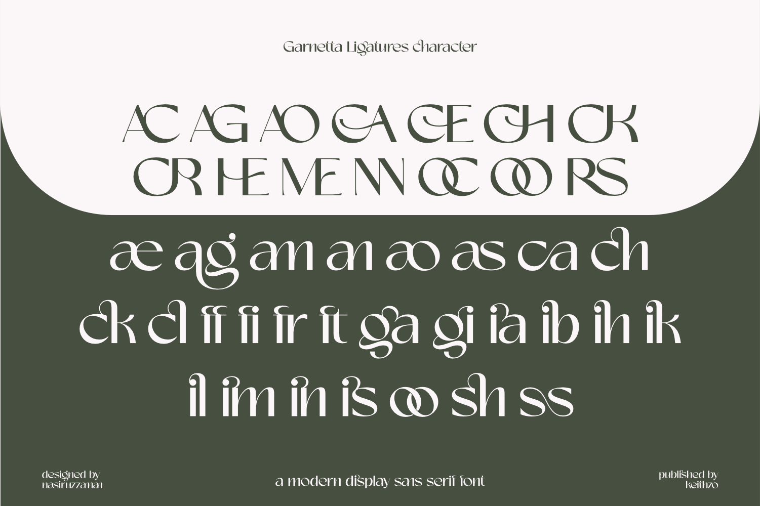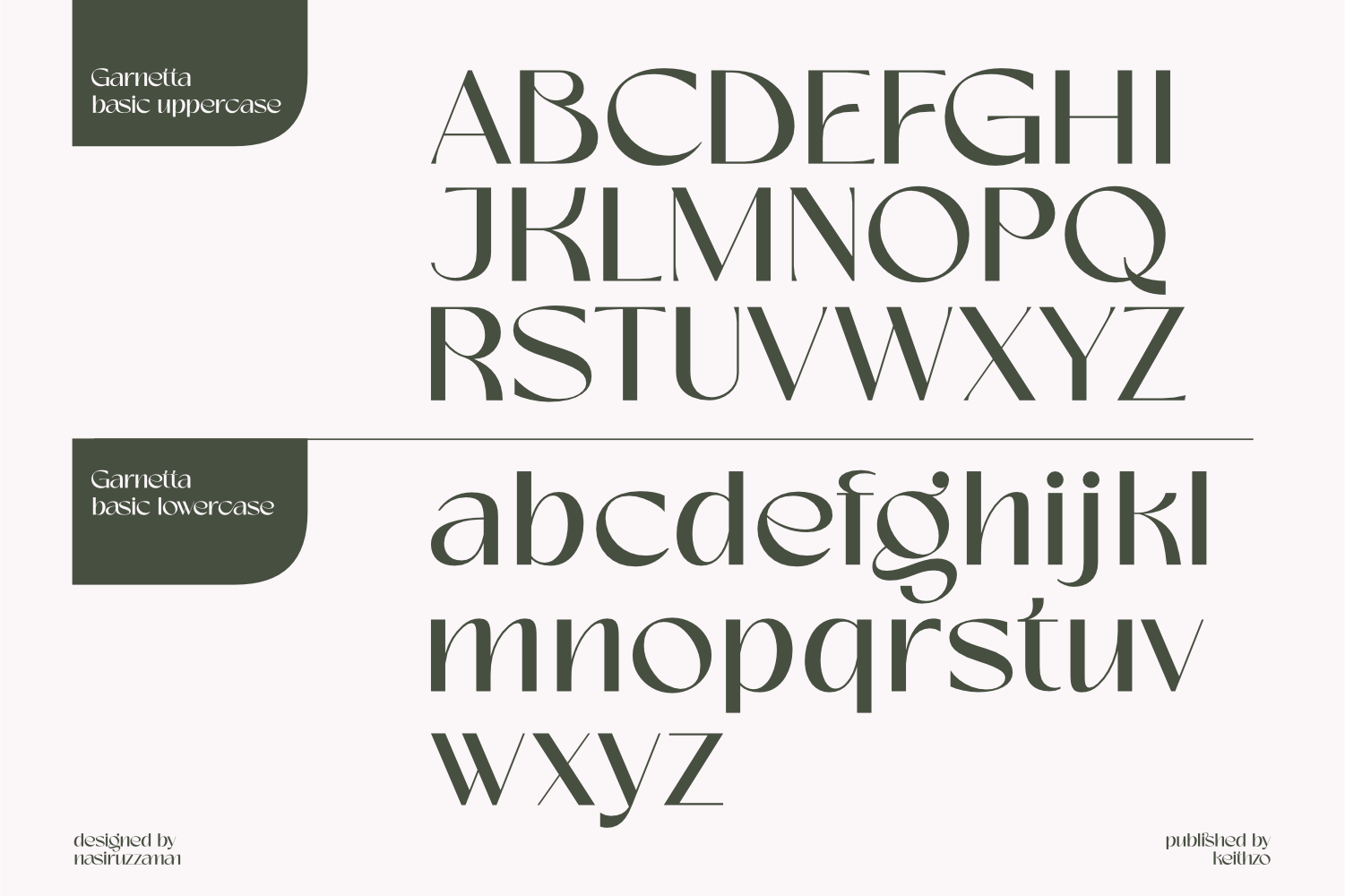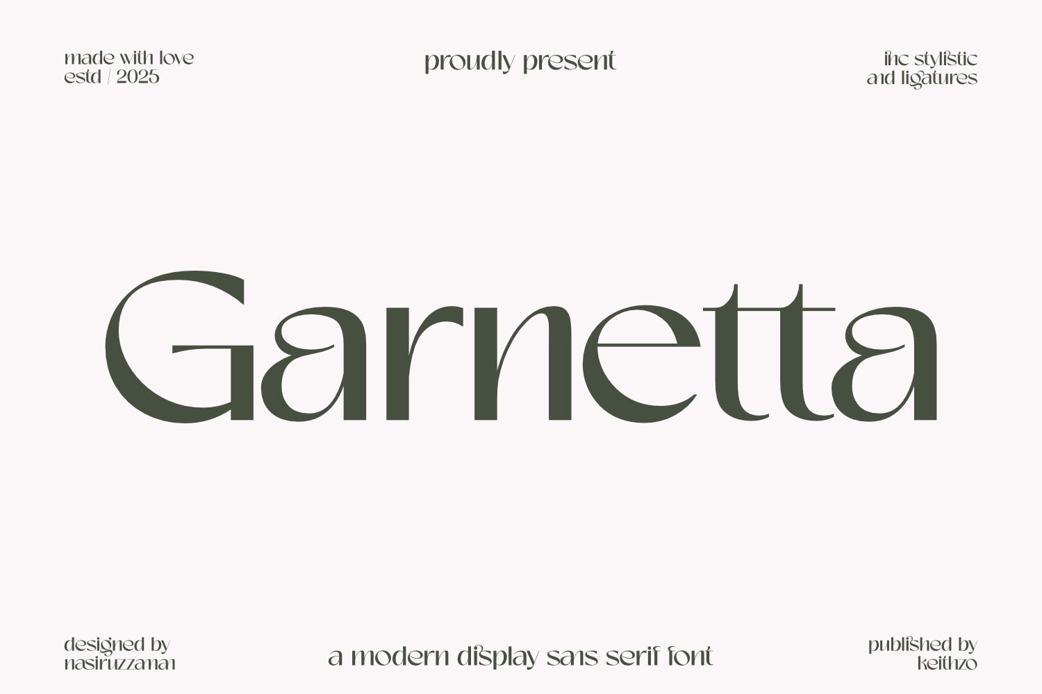 Garnetta is a carefully crafted modern display sans serif font, offering an aesthetic that is both luxurious and contemporary. Designed with precision, this typeface features an exceptional balance of strong, upright strokes and delicate, sweeping curves, giving it a distinguished and highly memorable appearance.