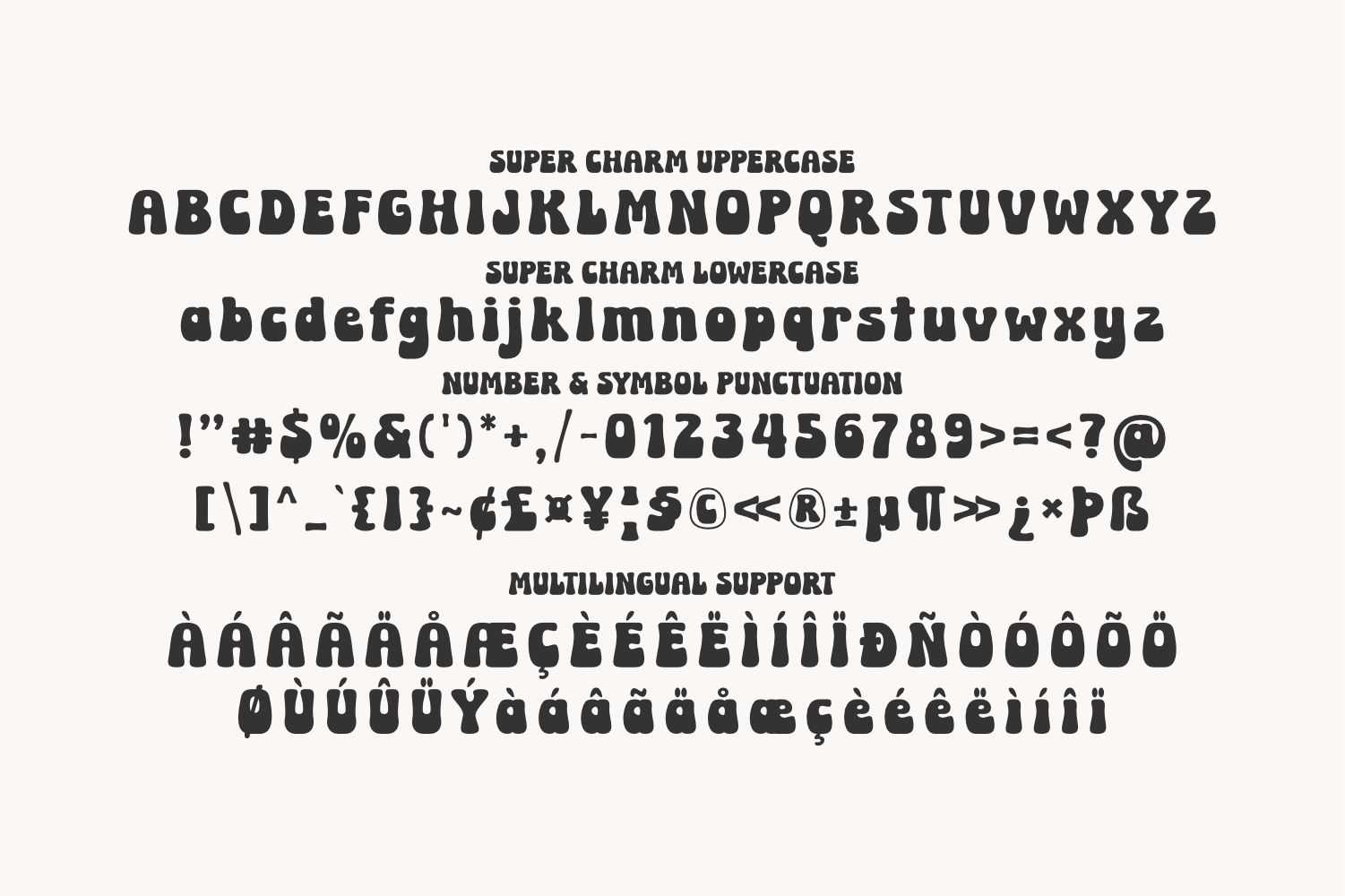 Use them together to create a dynamic contrast or separately for different styles. Super Charm is the ideal choice for branding projects, packaging design, invitations, merchandise, and anything that needs a sweet and authentic feel.