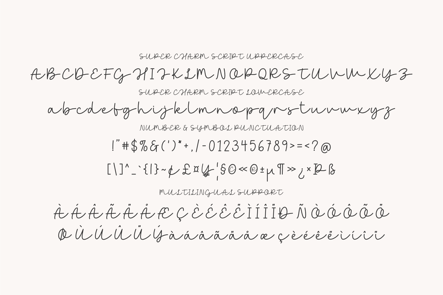 Super Charm Script: An elegant, flowing monoline script that adds a personal and authentic touch. Great for branding, signatures, or any design element that needs a bit of softness. The Super Charm Script font is enhanced with built-in swashes at every connection, making it easy to create beautiful, flowing text