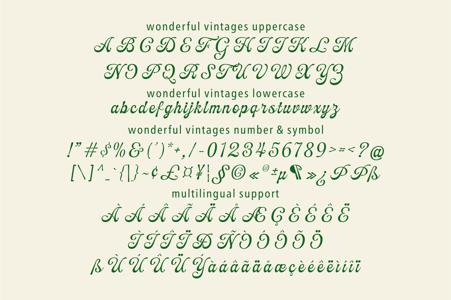 Immerse in the essential features of this Vintage Script font — it embodies the unique vintage style to its fullest, mirroring the golden era of classic typography. The broad character set comprises uppercase, lowercase, numerals, and symbols, each crafted with a distinctive vintage touch. Worry no more about language constraints; Wonderful Vintages comes equipped with extensive multilingual support, rendering it a choice selection for global projects. Its sleek retro lines are ideal for neat cutting with Cricut/Silhouette or creating high-grade, vintage print layouts.
